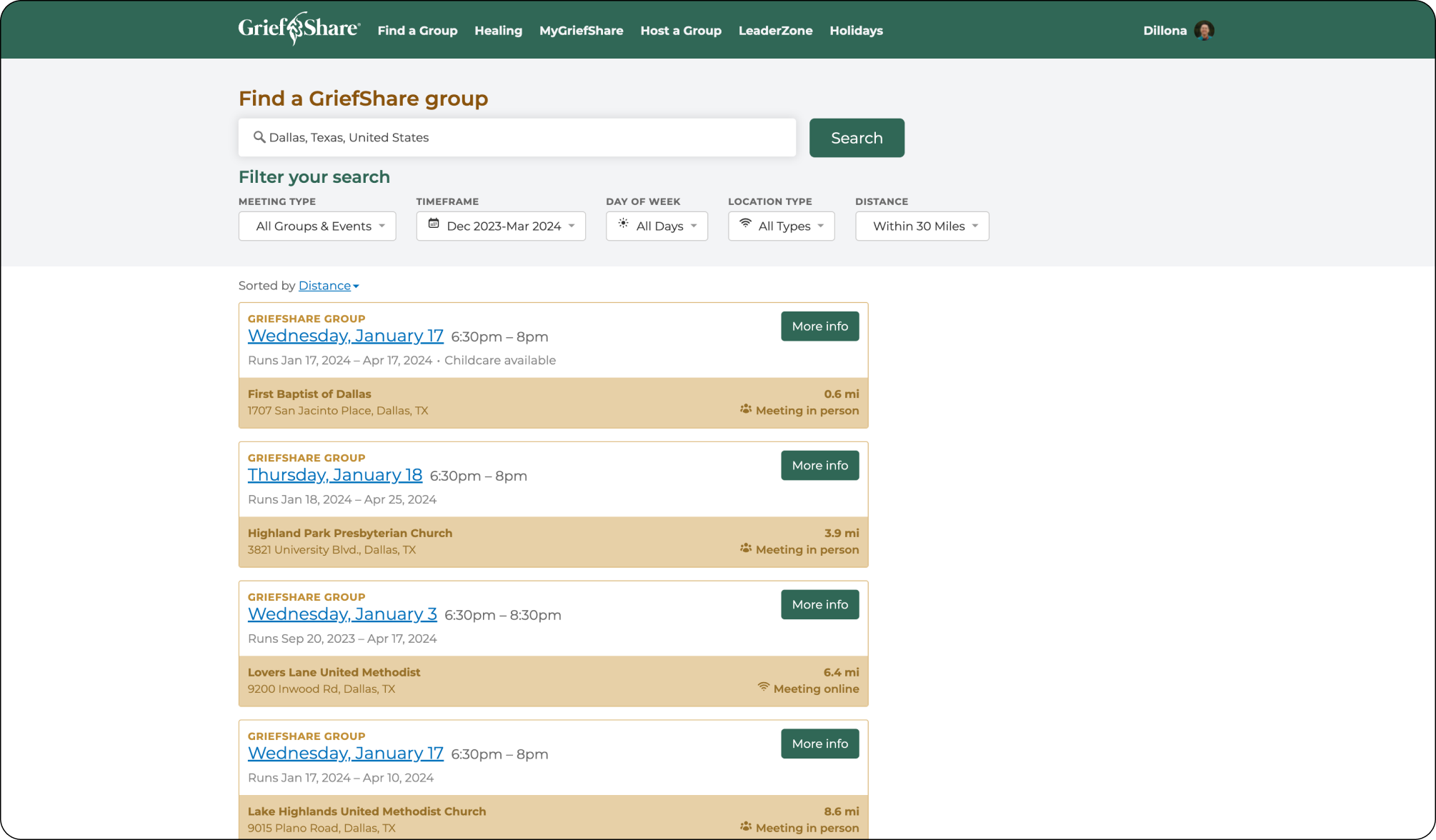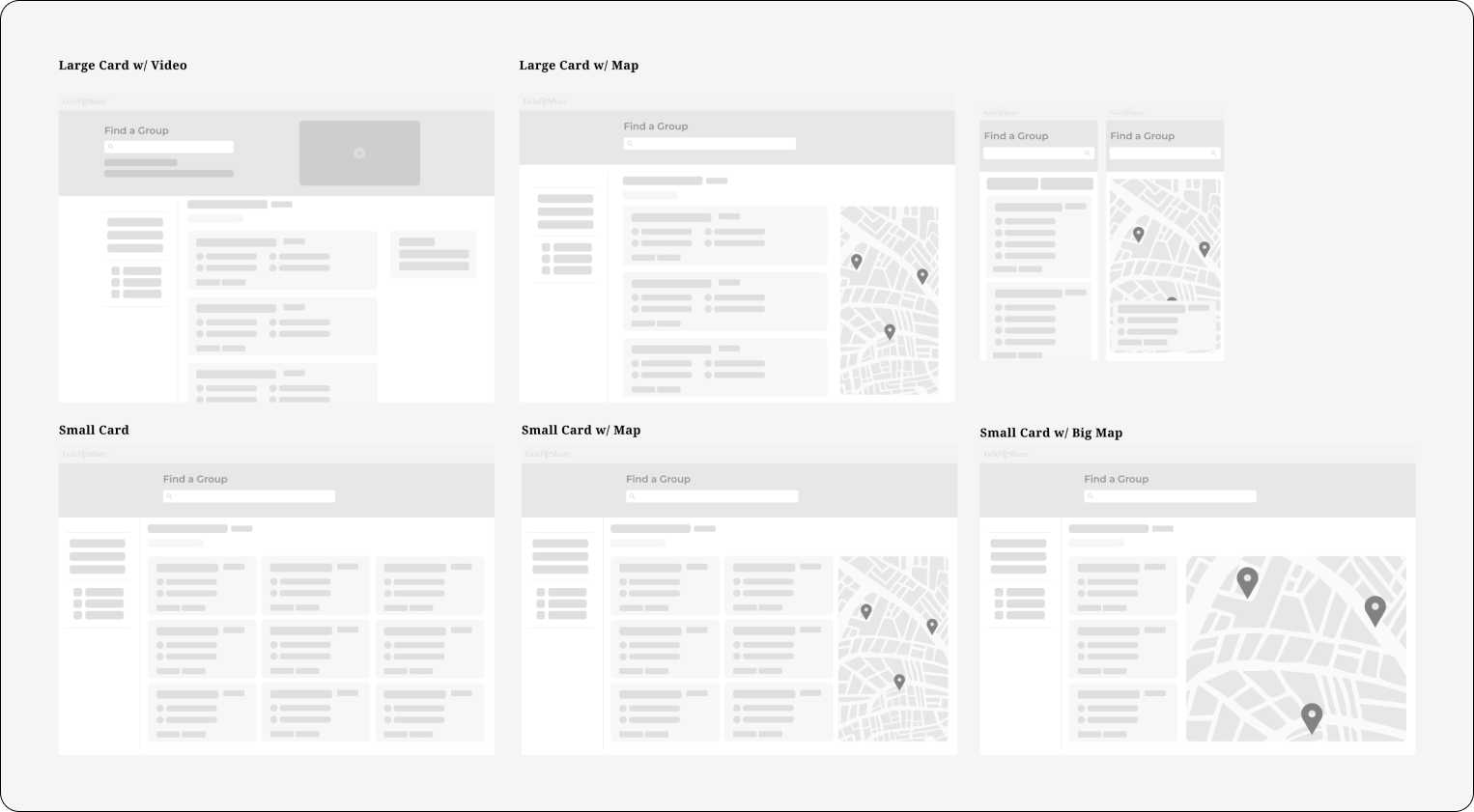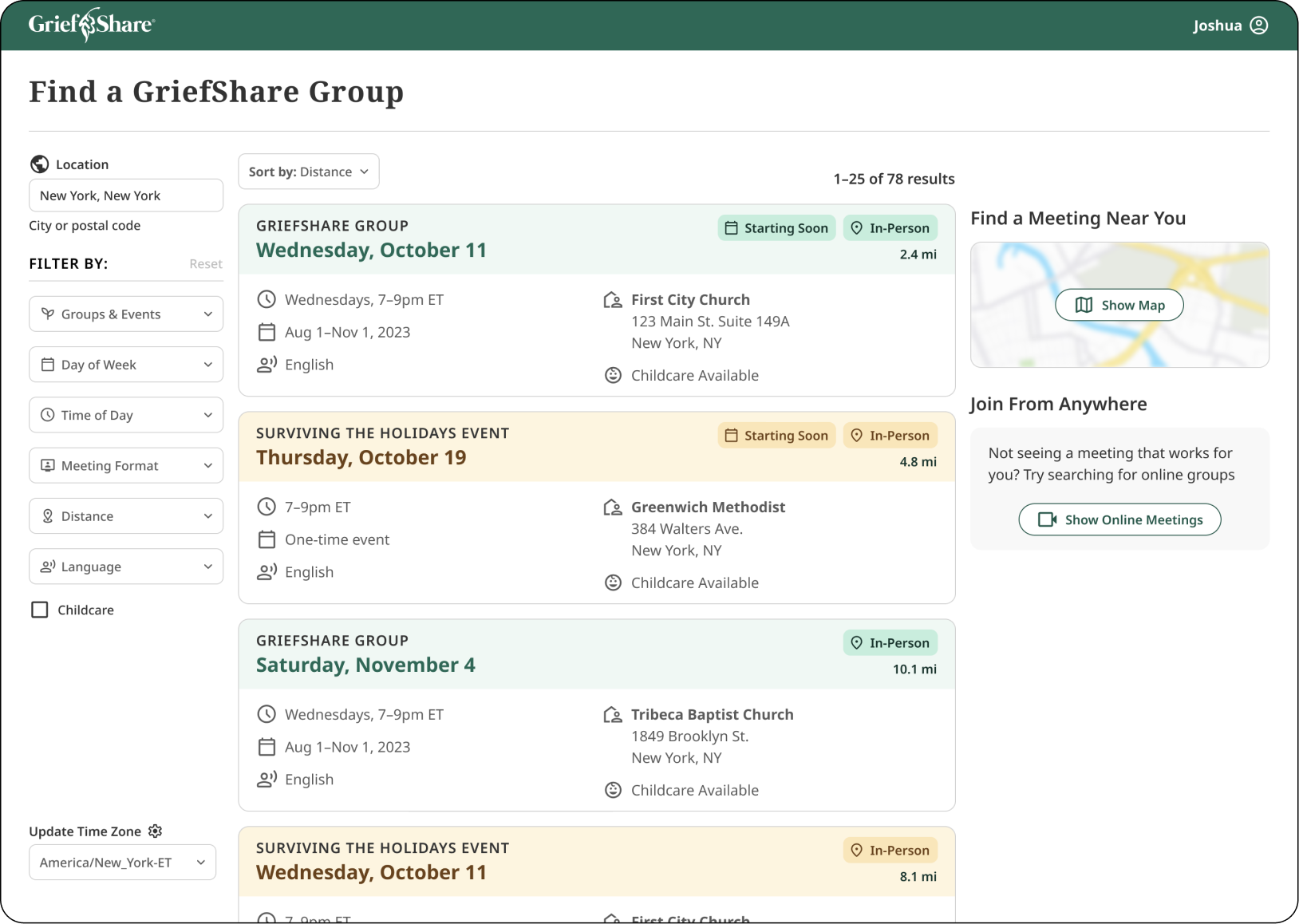 The Find a Group page adapts to the preferences of the user by hiding the map if they want a more traditional view with cards only.